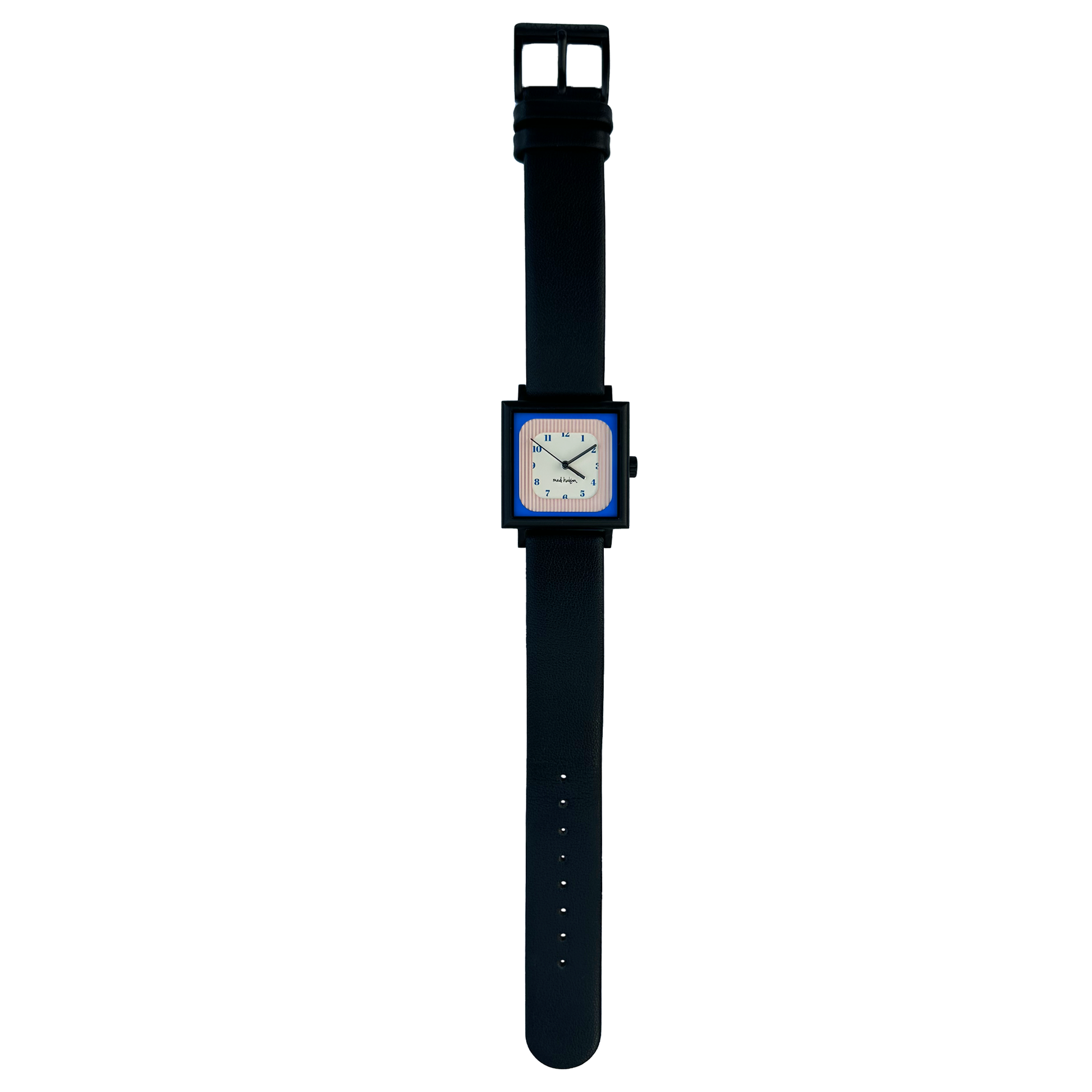 A structured square case frames a dial that stacks color, texture, and depth. Sun-washed blue, warm metallic tones, and soft pinks that shift as light moves across the face.